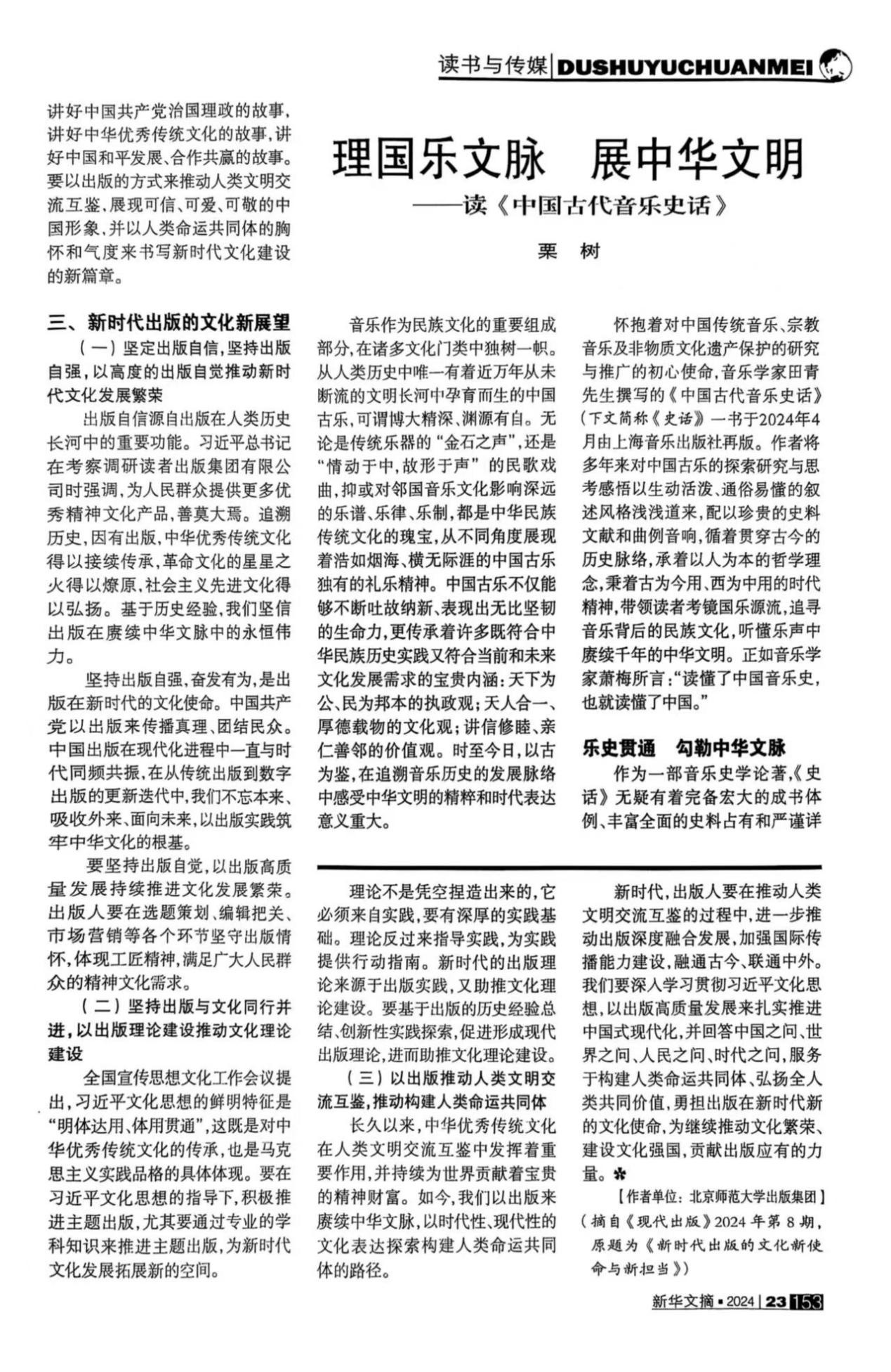 信阳师大新闻网讯 《新华文摘》2024年第23期全文转载了我校音乐与舞蹈学院副教授栗树博士的文章《理国乐文脉、展中华文脉》。该文原载于2024年9月16日的《光明日报》,全文近五千字,这也是栗树在《光明日报》发表的第三篇文章。